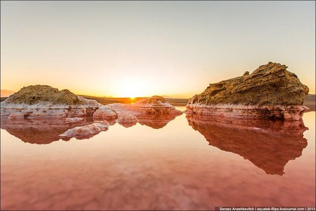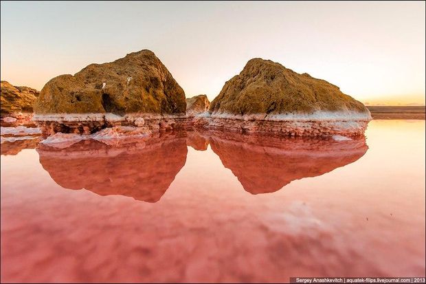 Це лиманне солене озеро – рожевого кольору. Це тому, що у воді багато одноклітинних водоростей, які містять у своєму складі червоний пігмент.